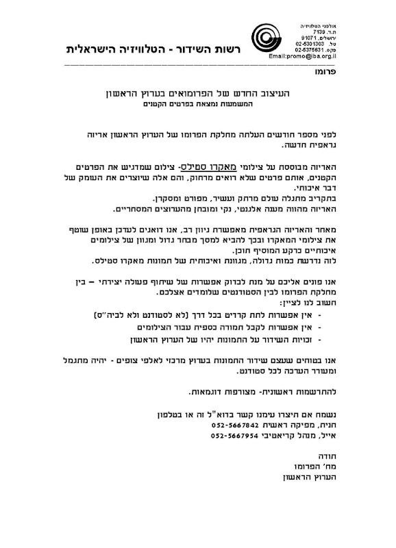 לא קרדיט לסטודנט הצלם ולא למוסד בו הוא לומד, לא תמורה כספית עבור הצילומים וכמובן שזכויות השידור על התמונות יהיו של הערוץ הראשון.